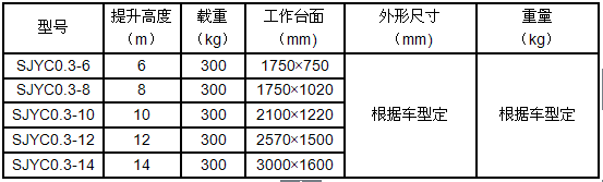 產(chǎn)品規(guī)格:車(chē)載式液壓升降平臺(tái)根據(jù)升降高度可分為:6、8、10、12、14米升降平臺(tái),設(shè)備載重300公斤至500公斤??蛻?hù)可根據(jù)需求選用解放、東風(fēng)、輕騎、福田、電瓶車(chē)等任何車(chē)型,設(shè)備直接采用汽車(chē)或電瓶的直接動(dòng)力升降。